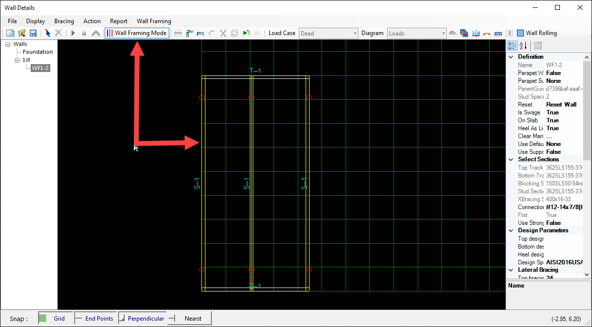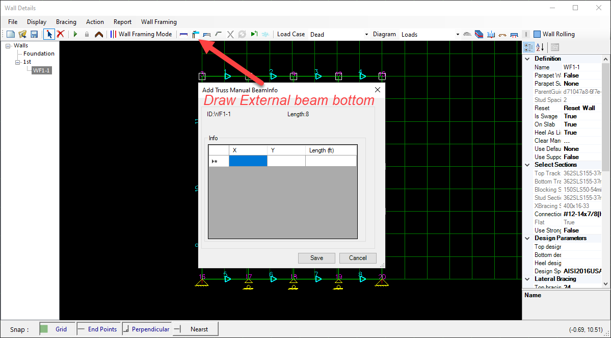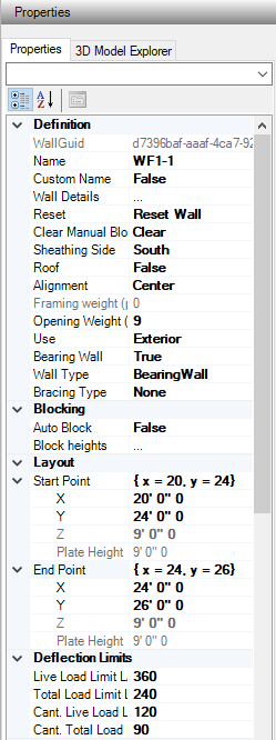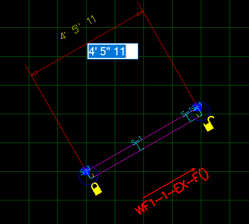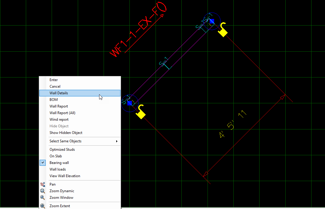 The program automatically assigns a WF wall ID to the wall (for exampleWF4 in the capture below). The complete wall ID will include a hint on whether the wall is exterior (EX) or interior (IN). If wall has a foundation, it will also include a hint of FDN.