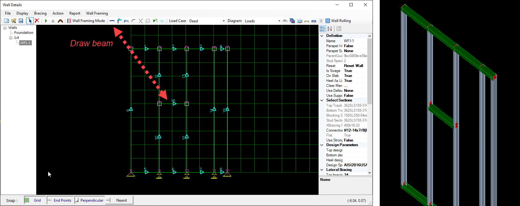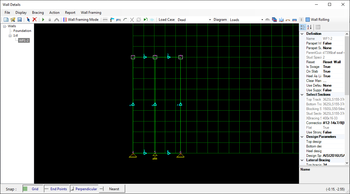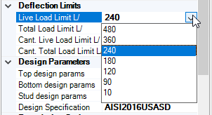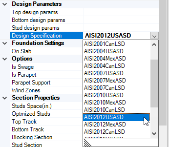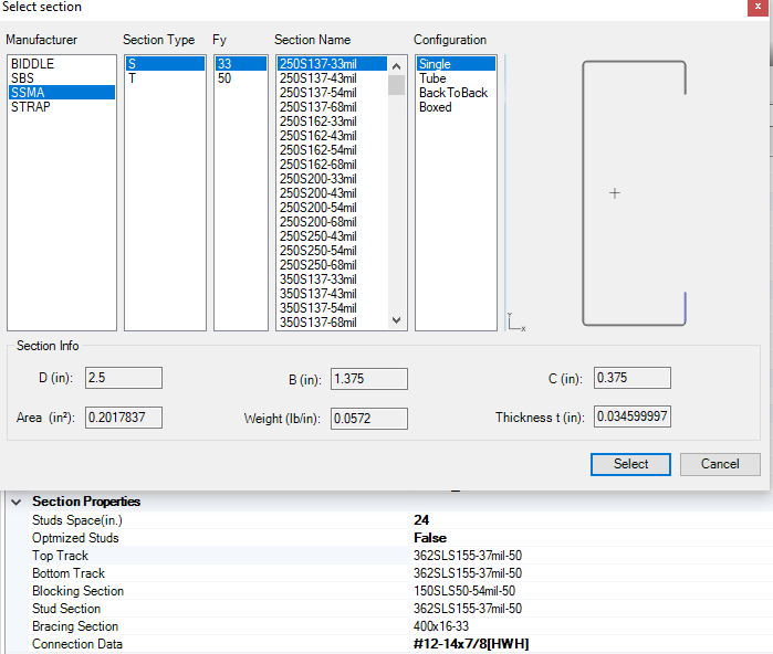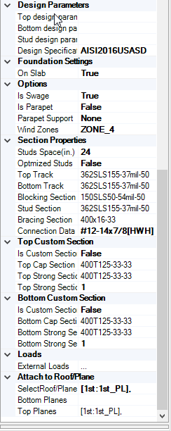 Section prosperities allow us to choose Stud spacing in inches select section from the available libraries and Configurations for each of Stud, Top track, Bottom track, Blocking and Bracing also, the Connection data. !!!!!!! Optimized studs mean adding stud under each truss or joist floor. This option is great to save material of top track