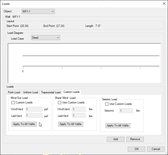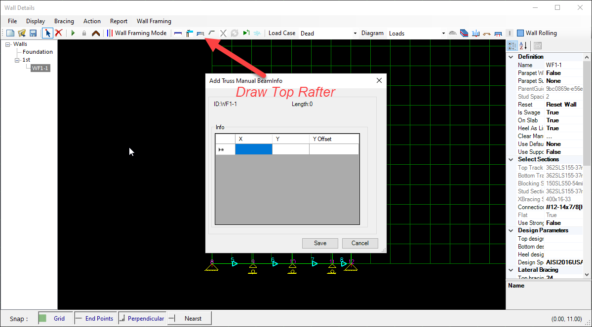 From Loads tab Users can add point load at any distance, Uniform load Trapezoidal load and use Custom load if they needed to insert it manually. Point loads will appear as red note on wall fig 39. Also we can choose load case to be as Dead, Live, Roof Live Load, Balanced Snow or Unbalanced snow.