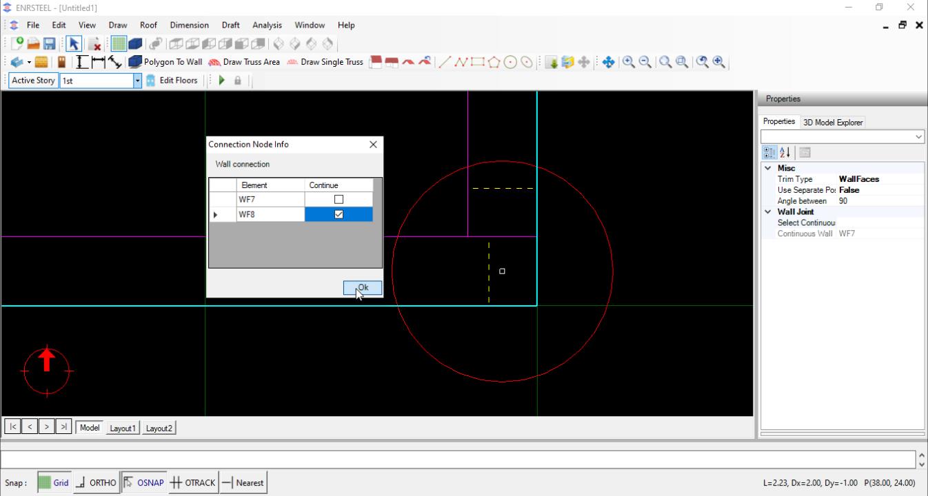 User can control wall trim by selecting which wall to continue at the intersections. User may use property grid after selecting the circle at the intersection. Alternatively, Right Click context menu of wall connection object provide quick access to edit connection properties including selecting trim type and continued wall.