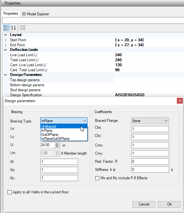 From design Parameters Users can choose bracing type for walls as well as they can change the bracing sittings and coefficients. The available codes its American, Canadian, and Mexican. Soon the European code will be added. Fig 37, 38.