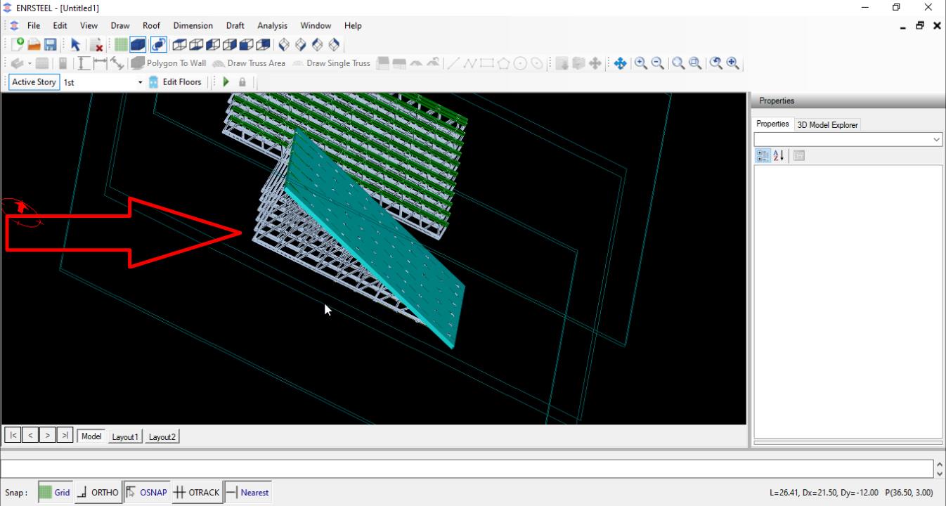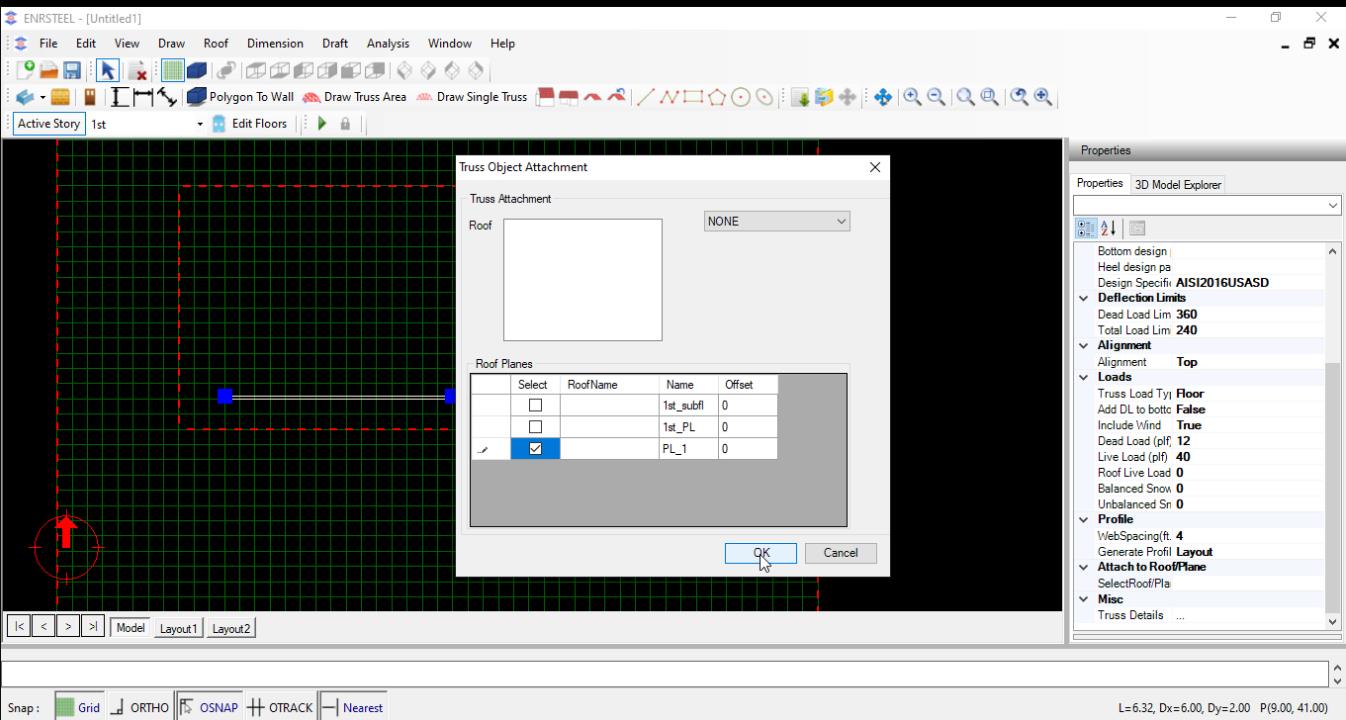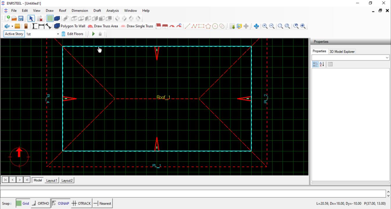 In Prosperities under attachment section to attach truss area to roof/plan they have to be drawn firstly then we draw a truss area at the border of that roof or plan. The last step to attach that truss area with it to take the correct shape automatically. Fig 52 explains attach trusses to roof and fig 54 explains attach trusses to plan.