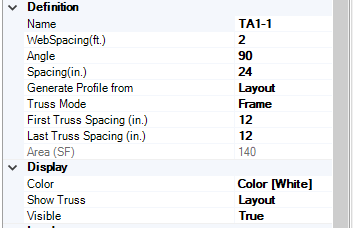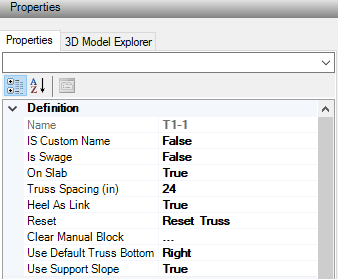 For Definition section in Single Truss the Properties will be same as Wall the additional here is Use Default Truss bottom which allow us to connect the top track and bottom track together from Right, Lift or both sides. Also, we can add a Support slope.