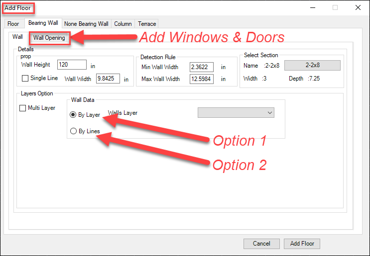 Users have 2 options to insert walls, roof, windows and doors . If they drew it by separate layers in AutoCAD they can use (Option 1) if not they have to drew lines at elements borders and use (Option 2).Users have 2 options to insert walls, roof, windows and doors . If they drew it by separate layers in AutoCAD they can use (Option 1) if not they have to drew lines at elements borders and use (Option 2).