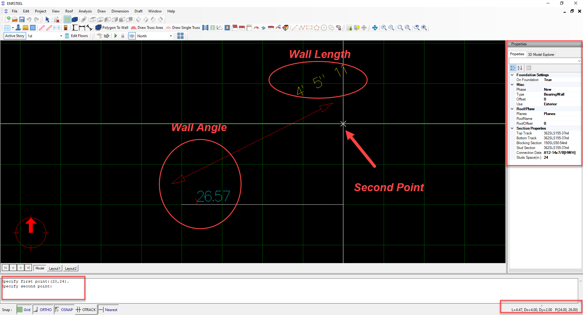When selecting to add a wall, user will be promoted to select first alignment point, then the second alignment point. The third click will be used to position wall with respect to the alignment line. For example, for vertical walls users may position wall left, centered or right of the alignment line.