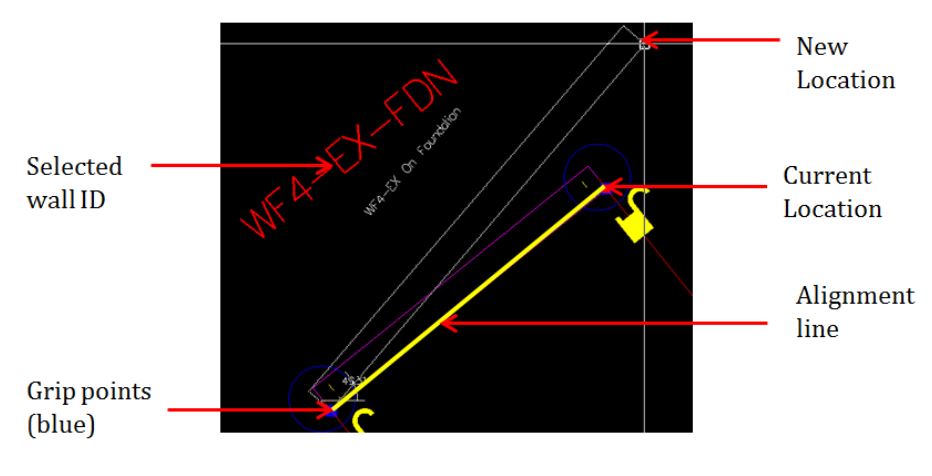 Once a wall is selected, the program highlights grip points (in blue color) at the start and end of alignment line of the wall. When user click on the grip point to be moved, the color changes to red indicating the point can be moved to a new location. Once user clicks at the new location, wall will be modified to reflect the coordinates. User can modify location of alignment line to facilitate the grip editing along certain lines.