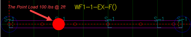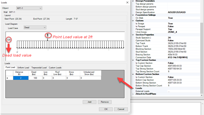 From Loads tab Users can add point load at any distance, Uniform load Trapezoidal load and use Custom load if they needed to insert it manually. Point loads will appear as red note on wall fig 39. Also we can choose load case to be as Dead, Live, Roof Live Load, Balanced Snow or Unbalanced snow.
