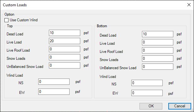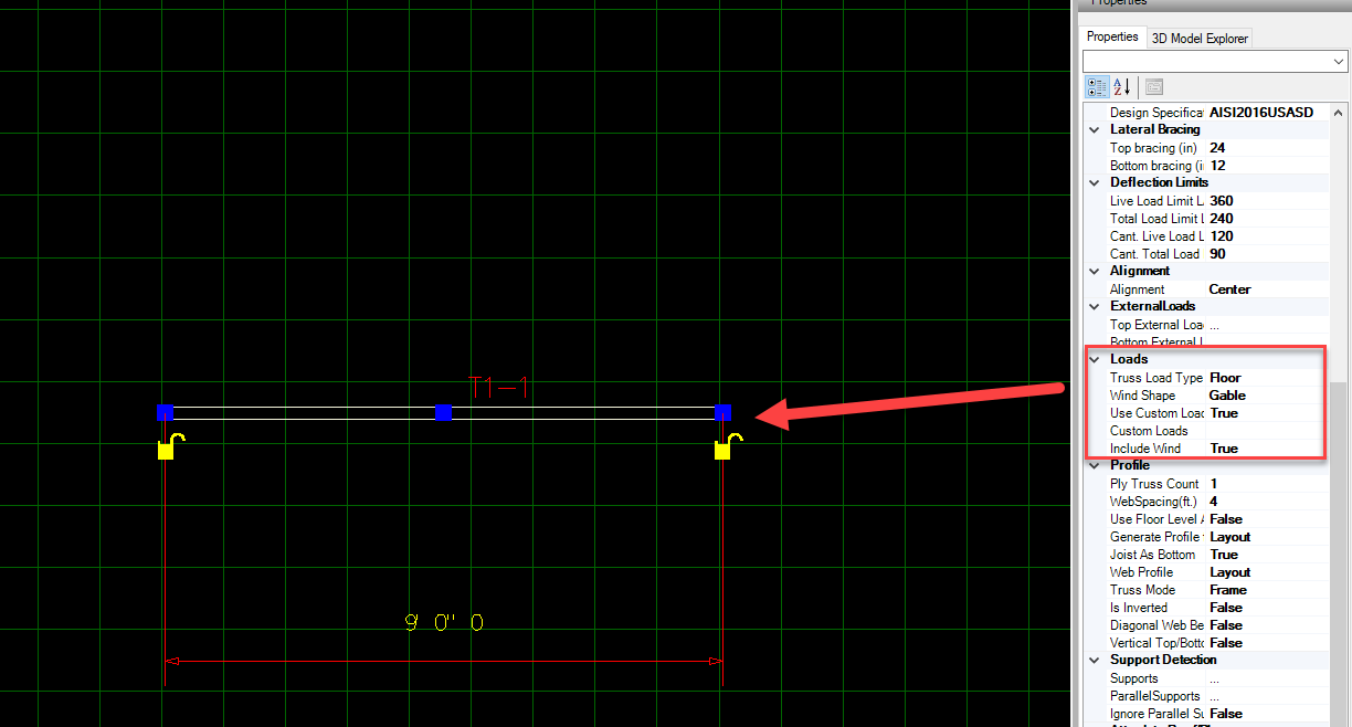 To add loads for Trusses select the Truss and hit left click on mouse to open properties window then go to Loads section for truss load type select one of (Floor, Roof, Ceiling), Select wind shape (Hip, Flat, Mono slope, Gable, None), then select custom loads (True, False), If you select True in custom loads the fig 61 will appear to insert loads data.